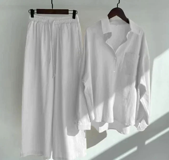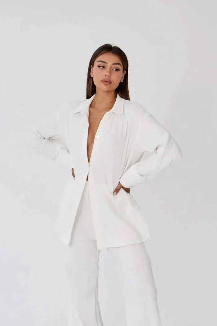 Découvrez l'ensemble d'été Geneve – deux pièces, des looks infinis ! Cet ensemble en lin aérien apporte style et légèreté à chaque journée d'été.