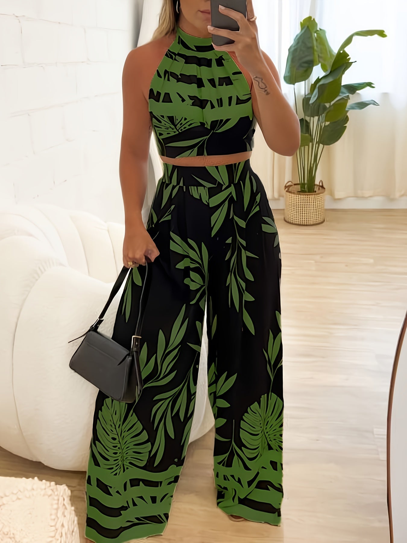 Entrez dans l'été avec style grâce à l'ensemble Hildur! Cet ensemble à imprimé de feuilles tropicales est parfait pour les femmes modernes qui souhaitent se démarquer. Composé d'un top court à col halter et d'un pantalon large assorti, il offre un look aéré, idéal pour la plage, les fêtes d'été ou un brunch décontracté.